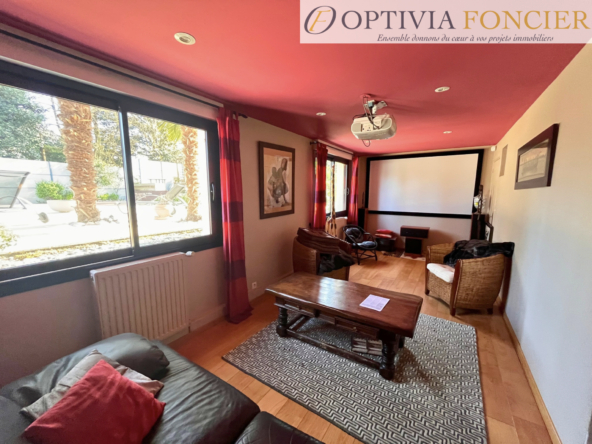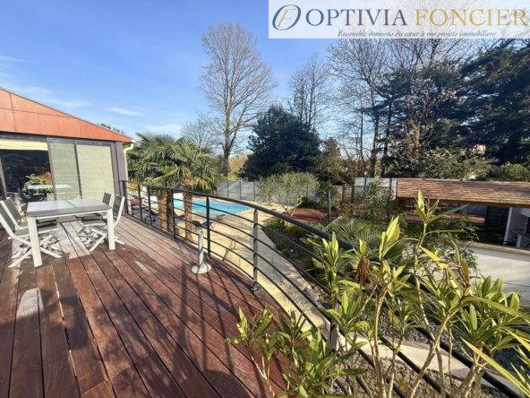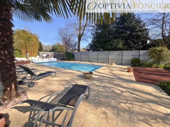 Implantée sur une parcelle arborée d’environ 2 200 m2, cette maison séduit par ses extérieurs soignés et intimistes, avec un jardin paysager, une piscine (10 x 4 m) et de nombreux espaces dédiés à la détente.