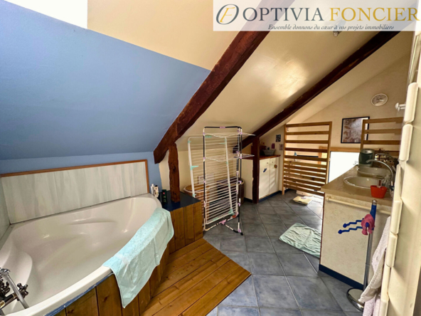 – Au deuxième demi-niveau : une volumineuse salle de bains avec double vasques et ses WC ;